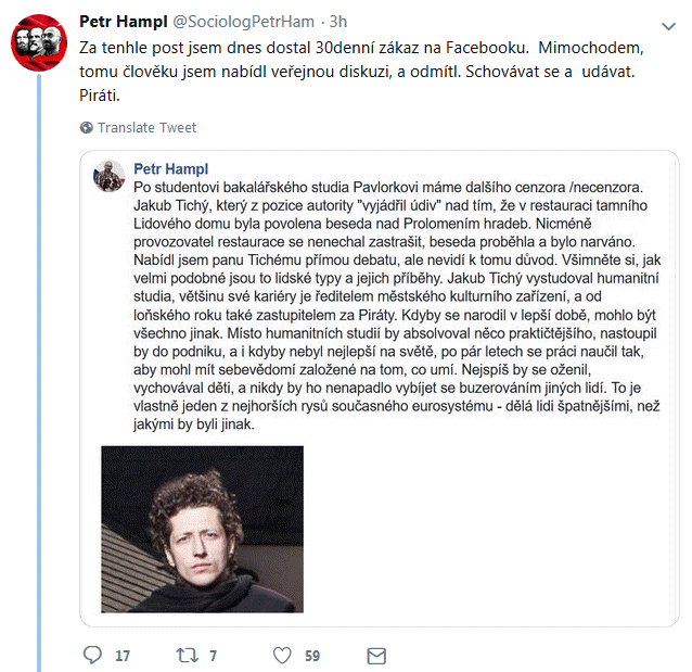 Proto se mi dělá na zvracení z takových těch rádoby liberálů (když bych chtěl škatulkovat, jako oni, řekl bych fanoušci TOP09 a spol), kteří mají demokracie plnou hubu, ale když řeknete cokoliv, co se jim nelíbí, začnou hned vřískat, že jsi nácek a že tě má ideálně cukrberg smazat.