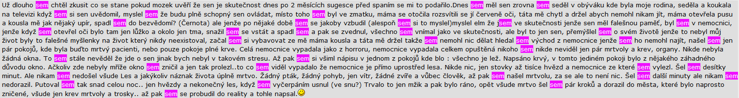 Už dlouho sem chtěl zkusit co se stane pokud mozek uvěří že sen je skutečnost dnes po 2 měsících sugesce před spaním se mi to podařilo.Dnes sem měl sen zrovna sem seděl v obýváku kde byla moje rodina, seděla a koukala na televizi když sem si sen uvědomil, myslel sem že budu plně schopný sen ovládat, místo toho sem byl ve zmatku, máma se otočila rozsvítili se jí červeně oči, táta mě chytl a držel abych nemohl nikam jít, máma otevřela pusu a kousla mě jak nějaký upír, spadl sem do bezvědomí? (Černota) ale jenže po nějaké době sem se jakoby vzbudil (alespoň sem si to myslel)myslel elm že jsem ve skutečnosti jenže sen měl falešnou paměť, byl sem v nemocnici, jenže když sem otevřel oči bylo tam jen lůžko a okolo jen tma, snažil sem se vstát a spadl sem a pak se zvednul, všechno sem vnímal jako ve skutečnosti, ale byl to jen sen, přemýšlel sem o svém životě jenže to nebyl můj život byly to falešné myšlenky na život který nikdy neexistoval, začal sem si vybavovat ze mě máma kousla a táta mě držel takže sem nemohl nic dělat hledal sem východ z nemocnice jenže sem ho nemohl najít, našel sem jen pár pokojů, kde byla buďto mrtvý pacienti, nebo pouze pokoje plné krve. Celá nemocnice vypadala jako z horroru, nemocnice vypadala celkem opuštěná nikoho sem nikde neviděl jen pár mrtvoly a krev, organy. Nikde nebyla žádná okna. To sem stále nevěděl že jde o sen jinak bych nebyl v takovém stresu. Až pak sem si všiml nápisu v jednom z pokojů kde blo : všechno je lež. Napsáno krvý, v tomto jediném pokoji bylo z nějakého záhadného důvodu okno. Ačkoliv zde nebyly mříže okno sem zničil a jen tak prolezl..to co sem viděl vypadalo že nemocnice je přímo uprostřed lesa. Nikde nic, jen stovky až tisíce hvězd a nemocnice ze které sem vylezl. Šel sem desítky minut. Ale nikam sem nedošel všude Les a jakýkoliv náznak života úplně mrtvo. Žádný pták, žádný pohyb, jen vítr, žádné zvíře a vůbec člověk, až pak sem našel mrtvolu, za se ale to není nic. Šel sem další minuty ale nikam sem nedorazil. Putoval sem tak snad celou noc.. jen hvězdy a nekonečný les, když sem vyčerpáním usnul (ve snu?) Trvalo to jen mžik a pak bylo ráno, opět všude mrtvo šel sem pár kroků a dorazil do města, které bylo naprosto zničené, všude jen krev mrtvoly a trosky.. až pak sem se probudil do reality a tohle napsal.