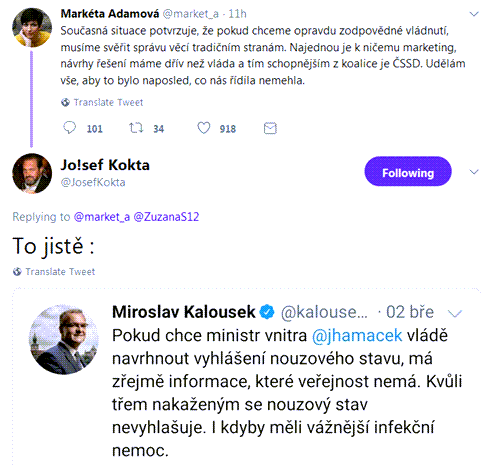 Uznavam teda, ze je to s koronavirem narocne. Treba dneska nejdriv ministryne Malacova malem pokousala ministra Vojtecha, na cez ten ji to hned vratil a na tiskovce na ni nebezpecne cenil zuby. A ted nevim, je to koronavirus nebo je to vzteklina nebo je to jen chybejici inteligence. :?: