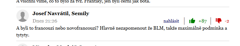 Ale u tebe je to marny, ty mas svuj spravny nazor a vsichni kdo ho nesdili jsou vypalani kokoti, ze? Nevadi, ze nikde neni prilis o utocnicich zminka, dnes je v mode u vseho nadavat na cernochy a migranty a nazyvat to vlastenectvim a "selskym rozumem".
