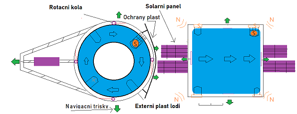 Nevím zda je ve vesmíru možné použít ke stabilizaci rotace magnetická síla, nebo polárni motor ? (v podstatě by musela být vyráběna co by znamenalo další potřeba vložení energie, tak vyvozuji že by to bylo spíš nevhodné). Jelikož by rotoval uvnitř konstrukce která v pohybu není byla by IMHO navigace snadnější -- neumím moc kreslit ale myslel jsem to nějak takle :