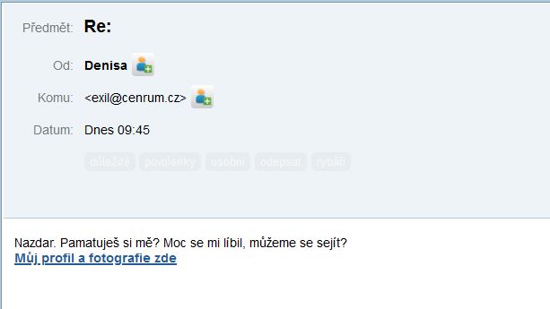 Tak jsem koukal na Seznam do SPAMu a dneska me chtela nejaka dvojcata dokonce, jinak ale minimalne jedna denne se seznamit chce. No maji smulu, Seznam to chyta do SPAMu na 100%. Pravda je, ze nespoleham uplne jen na automatiku, ale kdysi jsem udelal i filtry na nejprovarenejsi slova typu "zhava akce" atd. Ze skonci ve SPAMU i letaky kaufiku me vubec netrapi. :-)