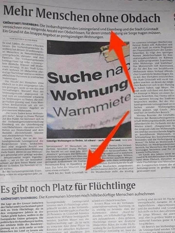 V Nemecku je v posledných rokoch ťažká situácia s bývaním. Životného priestoru čoraz viacej ubúda, ceny nájmov drasticky rastú, takže si už nemecké rodiny s menším príjmom alebo mladí ľudia si nedokážu dovoliť strechu nad hlavou a často sa to končí veľmi zle. Ale majú veľkú smolu, že nie sú pre mimovládky zaujímaví, inak by nemeckým bezdomovcom stačilo podpáliť si vlastné stany a okamžite by dostali luxusné ubytovanie v hoteloch.
