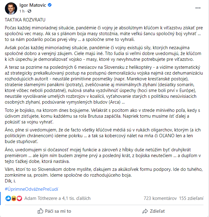 Náš premiérko napríklad dnes na tlačovke otvorene volal po umlčaní tých, čo majú opačný názor a správajú sa vraj "nezodpovedne". Dokonca už vyzýva aj k udávaniu podnikov, ktoré nedodržiavajú jeho nezmyselné pravidlá. To sme sa dožili.