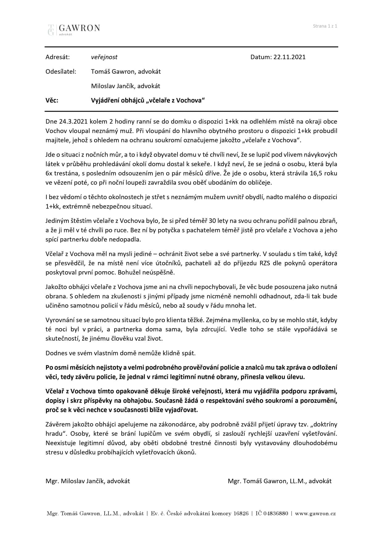 Z novinek k případu jen informace o advokátním zastoupení: Jana B. společně zastupují Mgr. Gawron a Mgr. Jančík, oba se dlouhodobě specializují mj. právě na problematiku NO a KN.