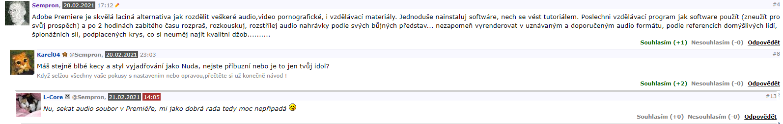 Nebudu se tady dohadovat kvůli takovému.... Sempronovi. Od začátku bylo jasné, že přišel provokovat a trollovat, takže jsem mu taky nějaké bláboly smazal a upozornil ho, že pokud nepřestane, dostane ban. Což platí stále...