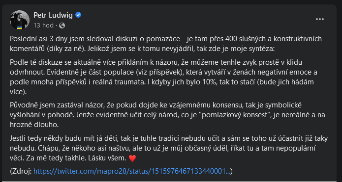 Jelikož jsem se k tomu nevyjádřil, zde je moje syntéza: podle té diskuse se aktuálně více přikláním k názoru, že můžeme tenhle zvyk prostě v klidu odvrhnout,“ zhodnotil Ludwig na základě názoru stovek žen.