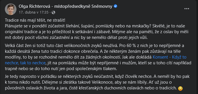 Pomlazka je tradice. Pokud nekdo pozaduje ruseni pomlazky, jde o ruseni tradic. Ludwig i Richterova… nový